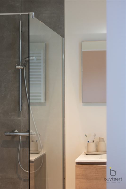 Ruim NIEUWBOUW twee slaapkamer appartement op de 1ste VERDIEPING in het centrum van Schilde! In een modern gebouw met lift bevindt zich dit appartement op de eerste verdieping, omvat inkomhal met ruimte voor een vestiairekast, gastentoilet, leefruimte met veel lichtinval en een groot schuifraam dat toegang geeft tot het mooi breed terras van 16m², open keuken met de nodige toestellen, aansluitend aan de keuken is er een ruime berging/wasplaats, twee slaapkamers waarvan de grootste slaapkamer met een ingerichte badkamer met lavabo meubel en douche en een tweede slaapkamer met een ensuite douchekamer. De ondergrondse parking zorgt ervoor dat thuiskomen in alle comfort kan gebeuren, dit appartement is voorzien van 1 autostaanplaats en een privatieve berging, huurprijs + 125€. Alsook een gemeenschappelijke fietsenberging op het gelijkvloers. Afwerking: aluminium ramen, vliegenramen, hr+ beglazing, vloerverwarming, cv op gas, gebouwd volgens BEN-principes,. Centrale ligging, gelegen nabij het dorp, vlakbij winkels, openbaar vervoer, gemakkelijke bereikbaarheid, in de buurt van fiets- en wandelroutes om de natuur op te zoeken. Dit appartement is volledig geschilderd en overal verlichting voorzien. Overname van gordijnen en lamellen in overleg. Gemeenschappelijke kosten gebouw: 125€/m. U bent van harte welkom voor een bezoekje!