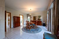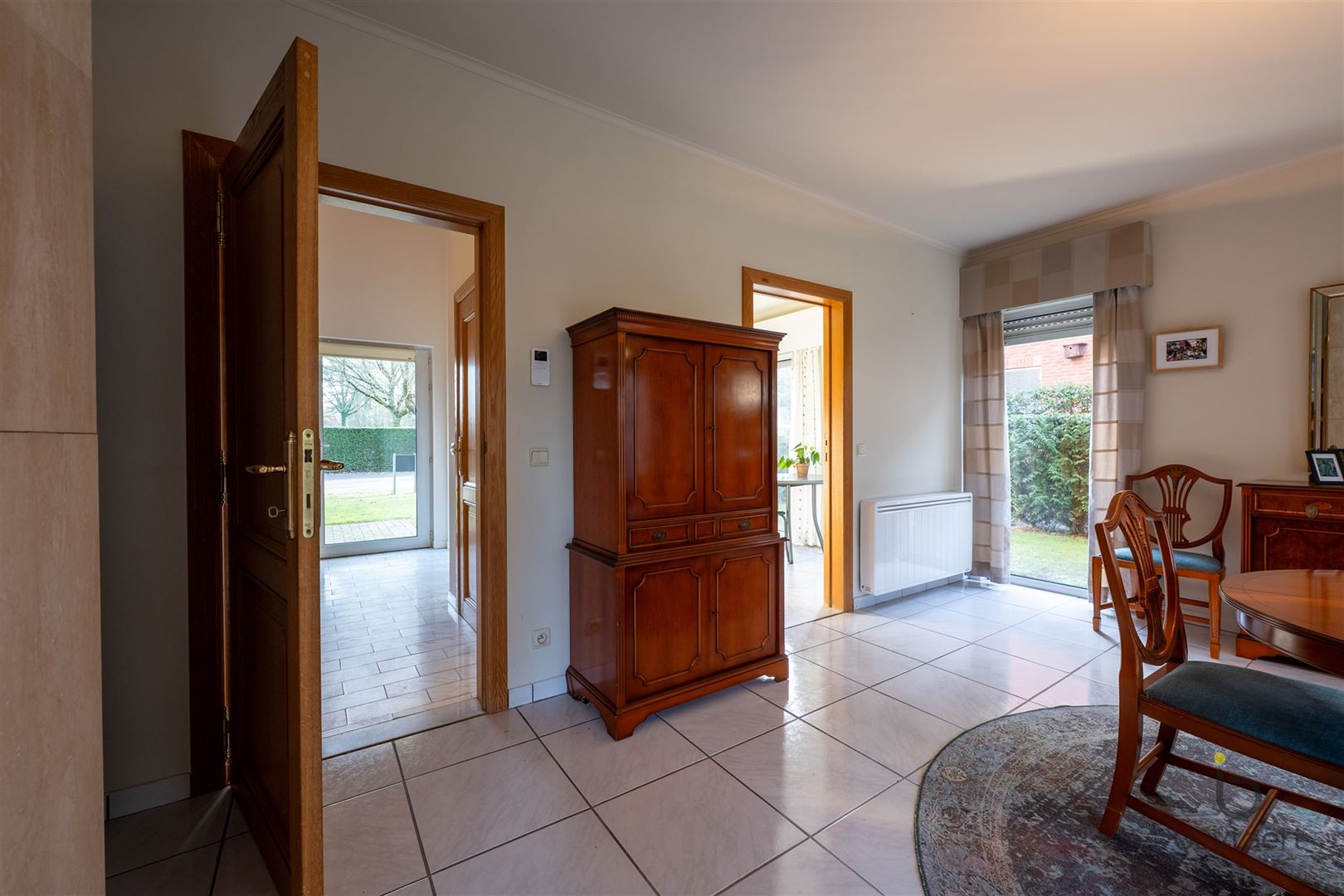 Binnenkomend in de inkomhal, gastentoilet, verder naar de leefruimte met salon en eetkamer, op een lichte vloertegel, voorzien van een cassette haard en uitzicht op de diepe tuin.