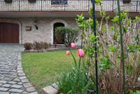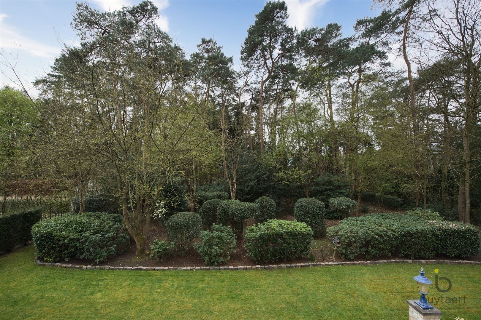 Aangelegde tuin, ook bereikbaar via een trap vanop het terras, de tuin is omheind en afgesloten met een automatische poort vooraan.
