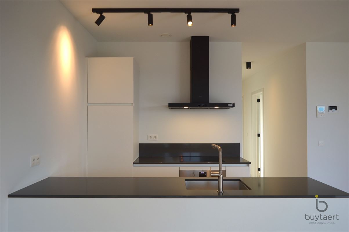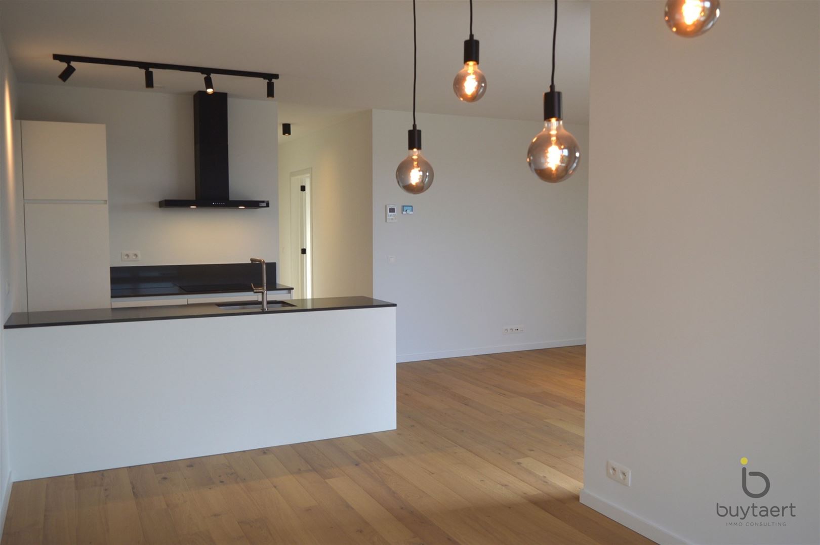 De leefruimte (34m²) is licht en aangenaam en sluit aan op een moderne open keuken, volledig uitgerust met AEG-toestellen. Het volledige appartement is afgewerkt met kwaliteitsparket, gordijnrails en verlichting.
