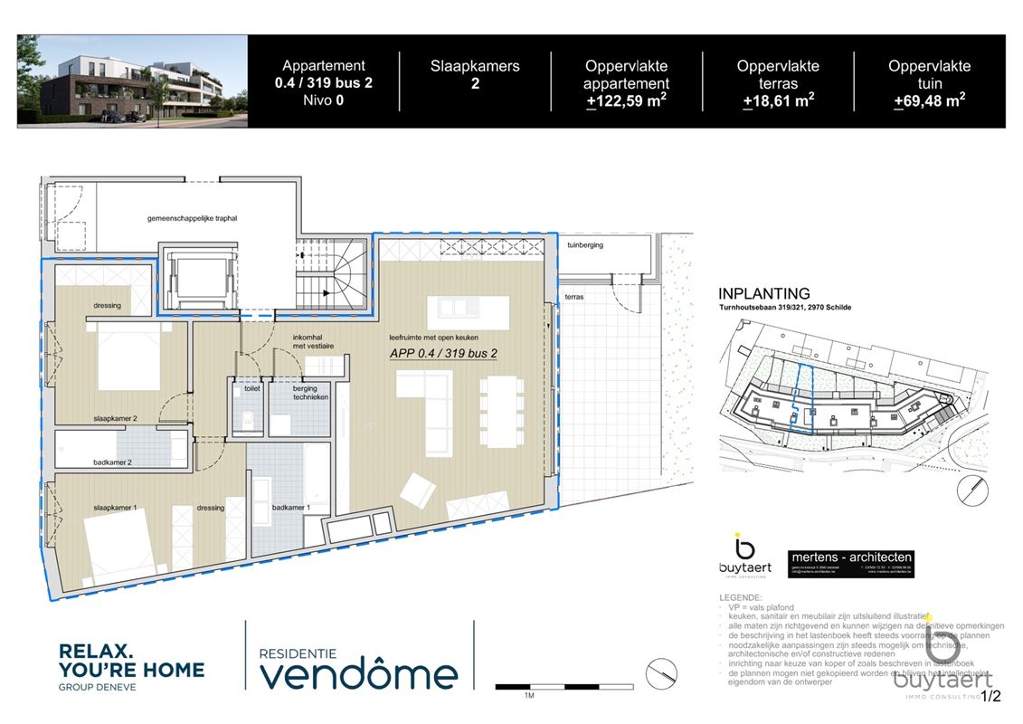 In dit nieuwbouwcomplex te Schilde bevindt zich op het gelijkvloers een ruim en luxueus 2 slaapkamer appartement met tuin, terras, kelderberging en een autostaanplaats. Indeling: inkomhal met vestiaire ruimte en gastentoilet, ruime en lichte leefruimte met toegang tot terras en privatieve tuin met berging. Een luxueuze ingerichte open keuken met alle nodige toestellen en toegang tot het terras. Berging - wasplaats met aansluiting voor wasmachine en droogkast. Twee volwaardige slaapkamers waarvan de masterbedroom met ensuite ingerichte badkamer met een dubbel lavabomeubel, douche en bad. Tweede slaapkamer met een ensuite douchekamer. Gezellig aangelegde West tuin met tuinberging zodat u optimaal kan genieten van de avondzon. De ondergrondse parking zorgt ervoor dat thuiskomen in alle comfort kan gebeuren, dit appartement is voorzien van 1 autostaanplaats en een privatieve berging, huurprijs +125€/m. Alsook een gemeenschappelijke fietsenberging en vuilnislokaal. Afwerking: aluminium ramen, hr+ beglazing, vloerverwarming, cv op gas, gebouwd volgens BEN-principes. Centrale ligging, gelegen nabij het dorp, vlakbij winkels, openbaar vervoer, gemakkelijke bereikbaarheid, in de buurt van fiets- en wandelroutes om de natuur op te zoeken. Dit appartement is volledig wit geschilderd, gordijnrails en verlichting zijn voorzien. Gemeenschappelijke kosten: 100€/m voor onderhoud van de gemeenschappelijke delen en de lift. Onmiddellijk beschikbaar. Bel of mail ons voor een bezichtiging, info@buytaertimmo.be